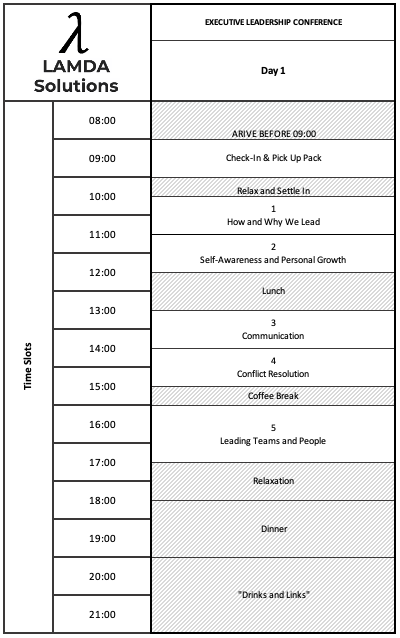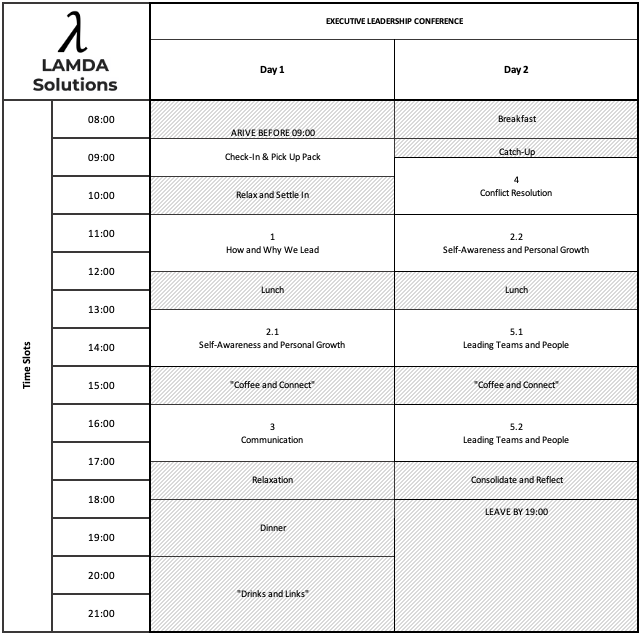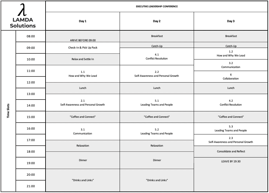 As a result of the conference, attending leaders will be equiped with new knowledge and skills to put them in the best possible position to address the areas for development. With the Silver package, this would be where we at LAMDA Solutions step aside. However, with the Gold and Platinum packages, we would follow-up the conference with one-to-one coaching and workshops, to ensure that the new knowledge and skills are effectively implemented for the benefit of all three stake-holders.