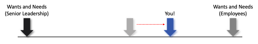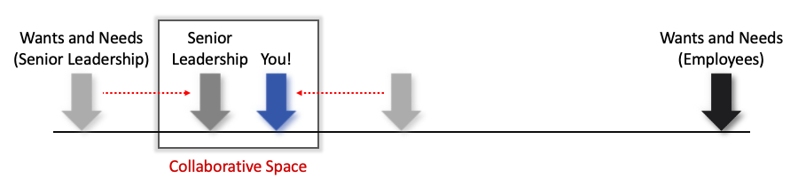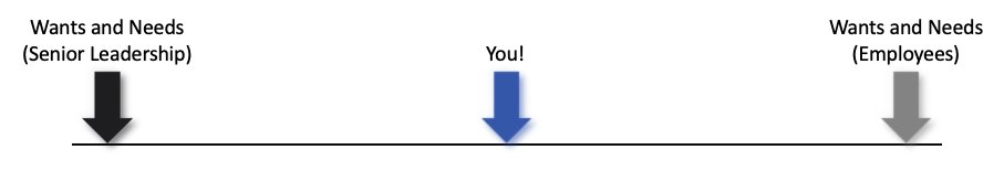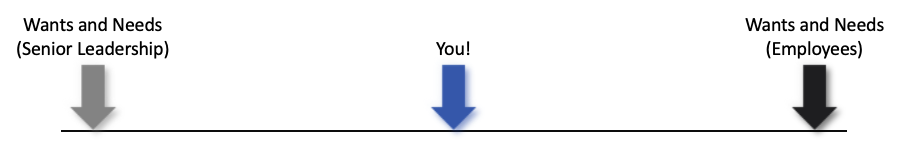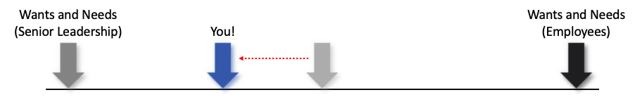 Ultimately our goal here is to bring each party closer towards the middle, from whatever opposing position they may have.  We are acting as a reality check to senior leadership with respect to the “boots on the ground” while acting to lead your team within the umbrella of the organisation with you team themselves.  You must be a leader, taking care of those in your charge, while taking them to places they never thought they could go on their own.