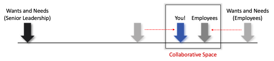 In doing this step, you move yourself closer, in the eyes of the organisation and the senior leadership team, towards wanting to achieve the shared goals of the organisation and therefore they too will be more open to moving closer to the middle ground.  The aim here is to bring yourselves together in order to collaborate on a solution, the closer you can become the more successful you could be in co-creating a solution which builds in some of the wants and needs of your team.