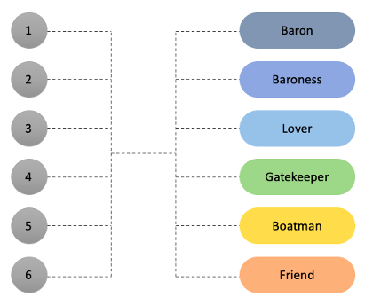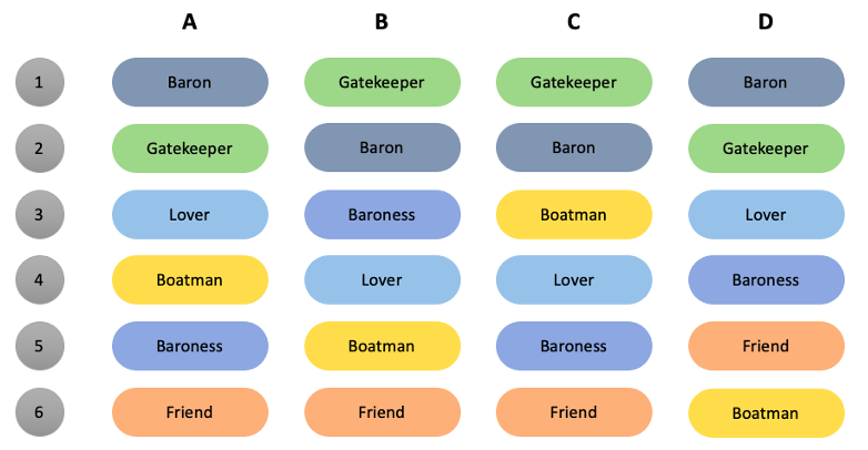 Upon hearing this a first time, each participant is asked to individually rank the 6 characters in the story in order of their level of responsibility for the death of the Baroness.